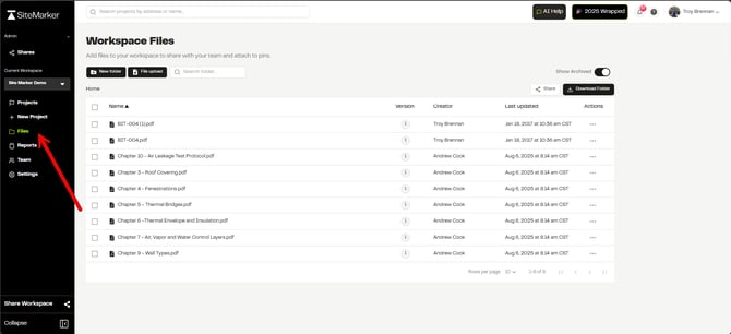 - Go to Workspace Files in your sidebar and upload your documents. PDFs, detail sheets, spec books, whatever your team references in the field. Organize them into folders if you want. See more on files here.
