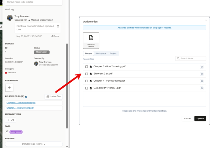 - Open any pin and click Update Files. You'll see your recent files, workspace files, and project files in one picker. Select the documents that apply to that pin and hit Update.