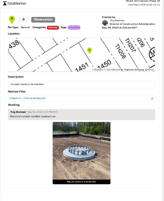 - When you generate a report, attached files appear on the pin's report page. The site photo, the location, the notes, and the reference document, all on one page. No flipping between systems to cross-check what was installed against what was specified.